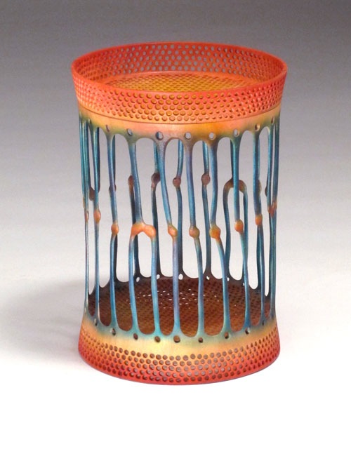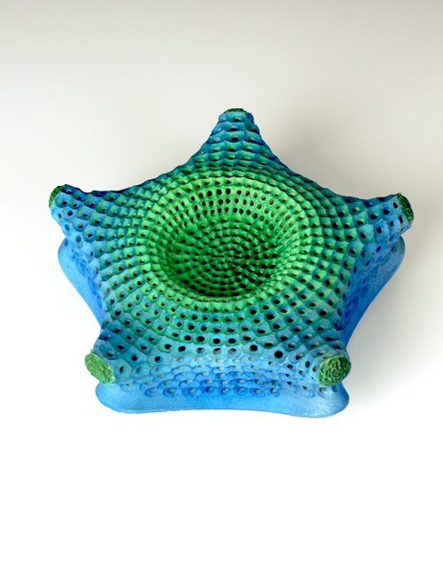 Diatoms are usually unicellular, but can exist as colonies. There are about 100,000 species of diatoms in a wide variety of shapes and sizes. Diatoms have an amazingly intricate and beautiful cell wall (called a frustule) when studied using a scanning electron microscope. Images of these frustules that I have found searching the internet form the inspiration for this series.